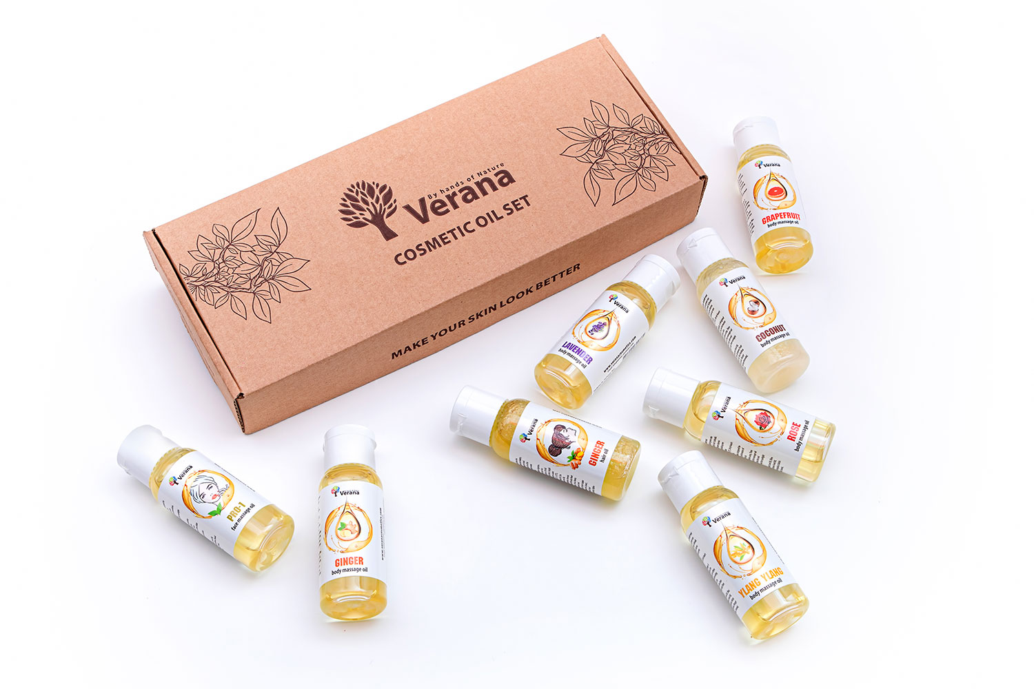 Verana produces a large assortment of the following products: hair oil, face massage oil, body massage oil, sports massage oil, body massage wax, body massage cream, sports body massage cream, oil after depilation and waxing, body scrub, foot scrub, hand scrub, hand cream butter, foot cream butter, protective hand and nail cream, protective foot and nail cream, professional oil for erotic massage.